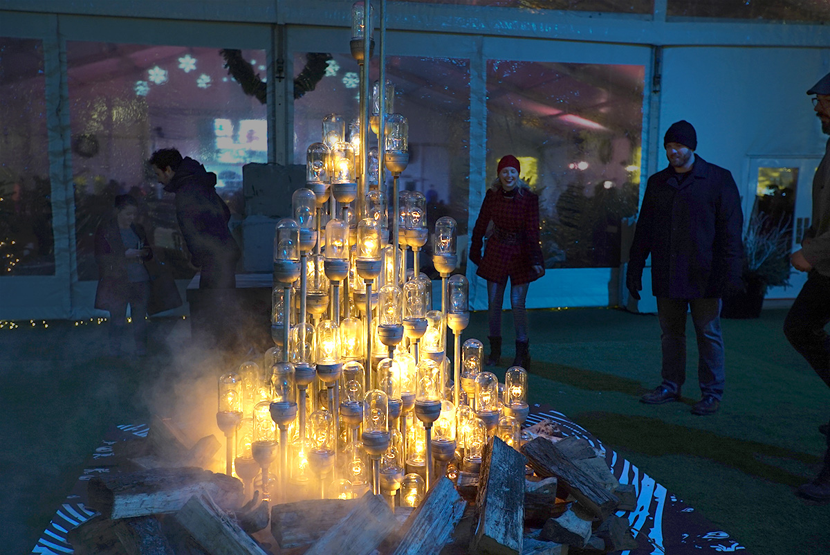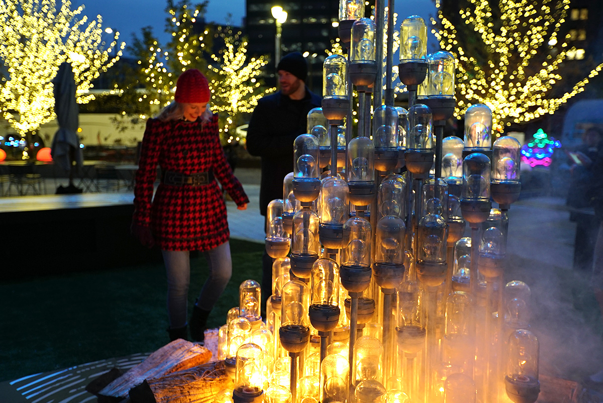 Installation interactive lumineuse et sonore, l’Ilot de chaleur_V2 recréer à l’aide d’ampoules d’incandescente, un feu de joie festif et musical. Un feu de camp participatif dont les sons et les mouvements des flammes sont dictés par l’activité des visiteurs.