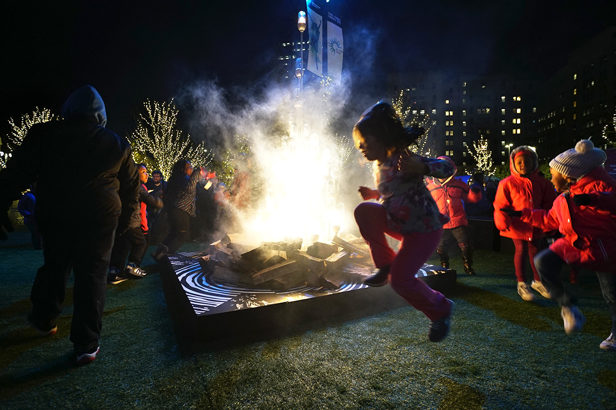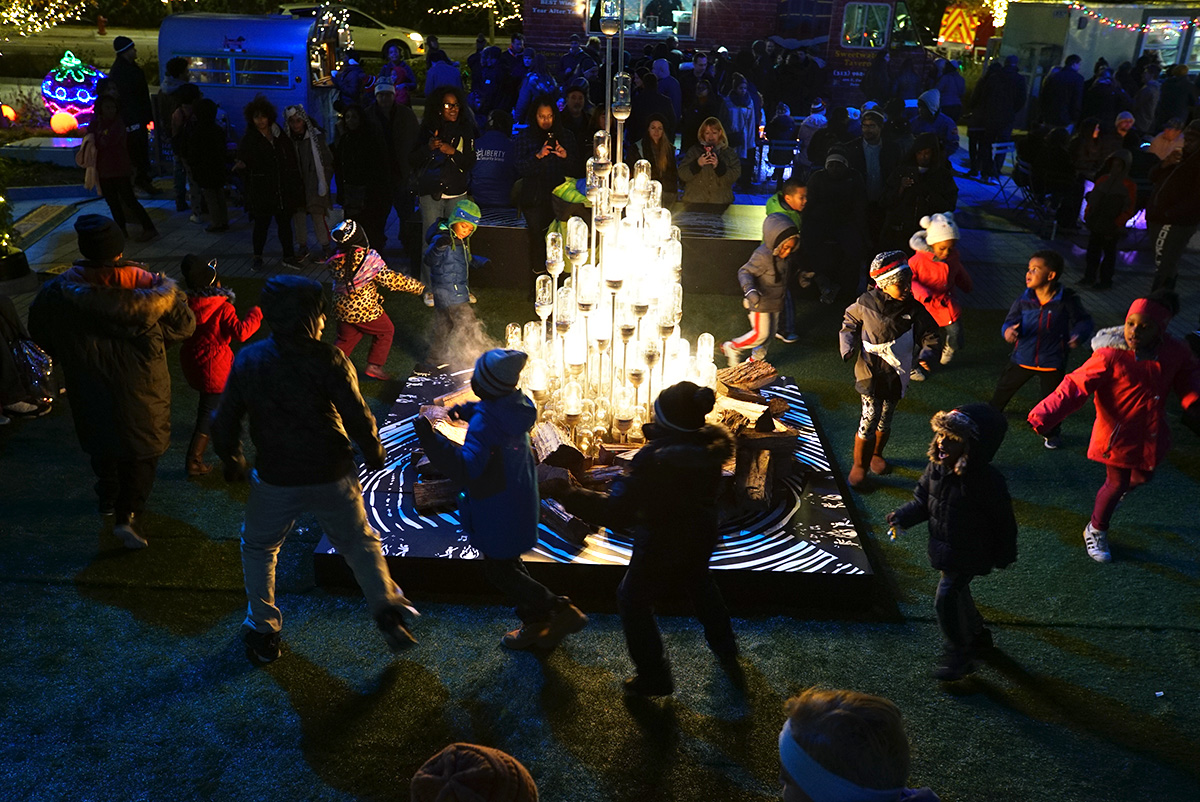 Grâce à des capteurs placés sous le plancher, ils peuvent dicter le comportement des flammes et la musique créée par les sons du feu. Qu’ils dansent, qu’ils sautent, qu’ils courent, les visiteurs attisent les braises, réveillent les flammes et font voler les étincelles.